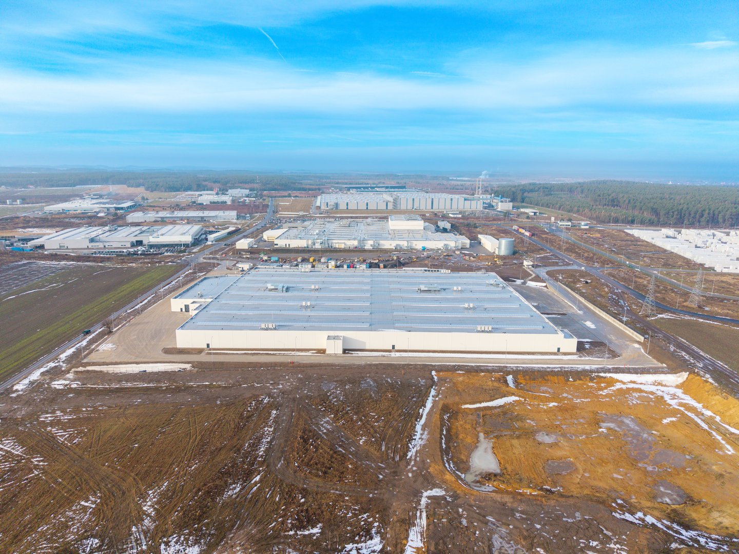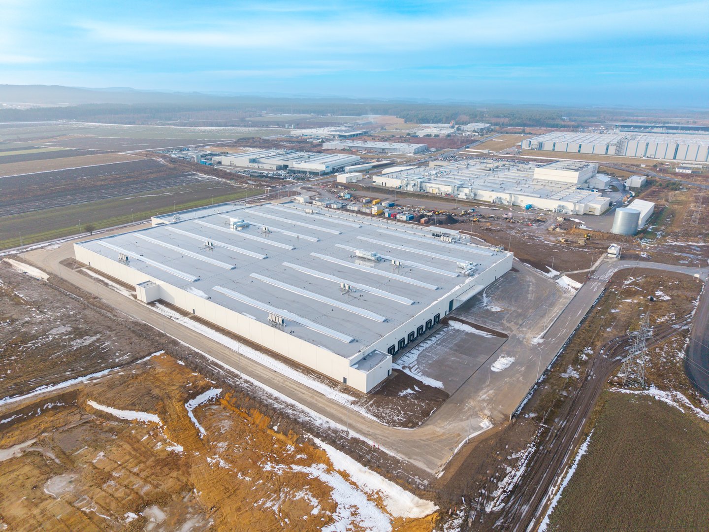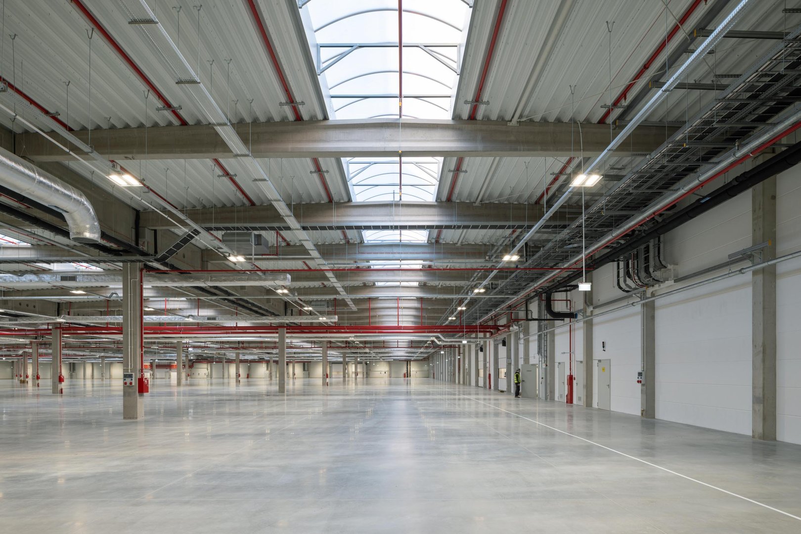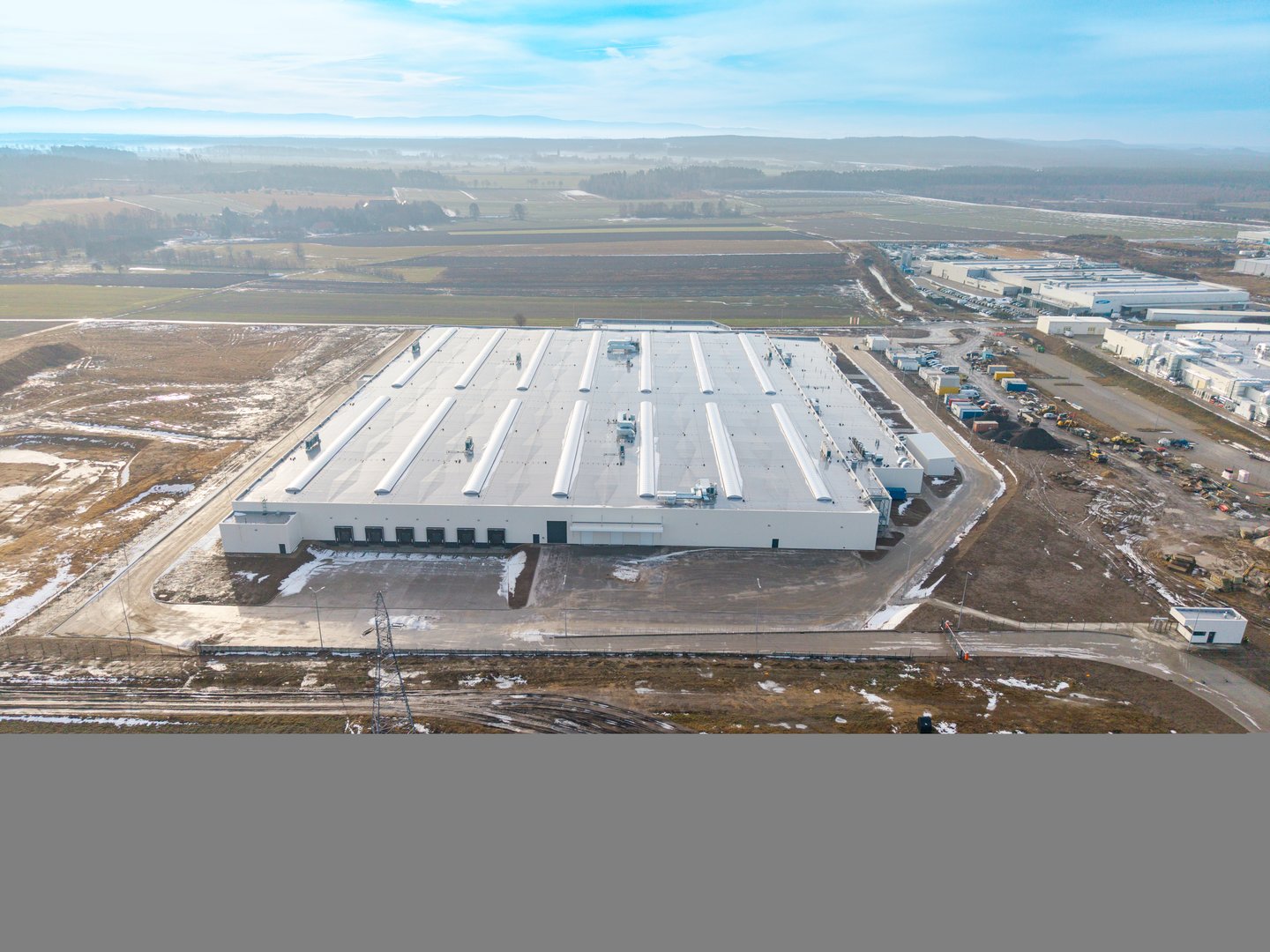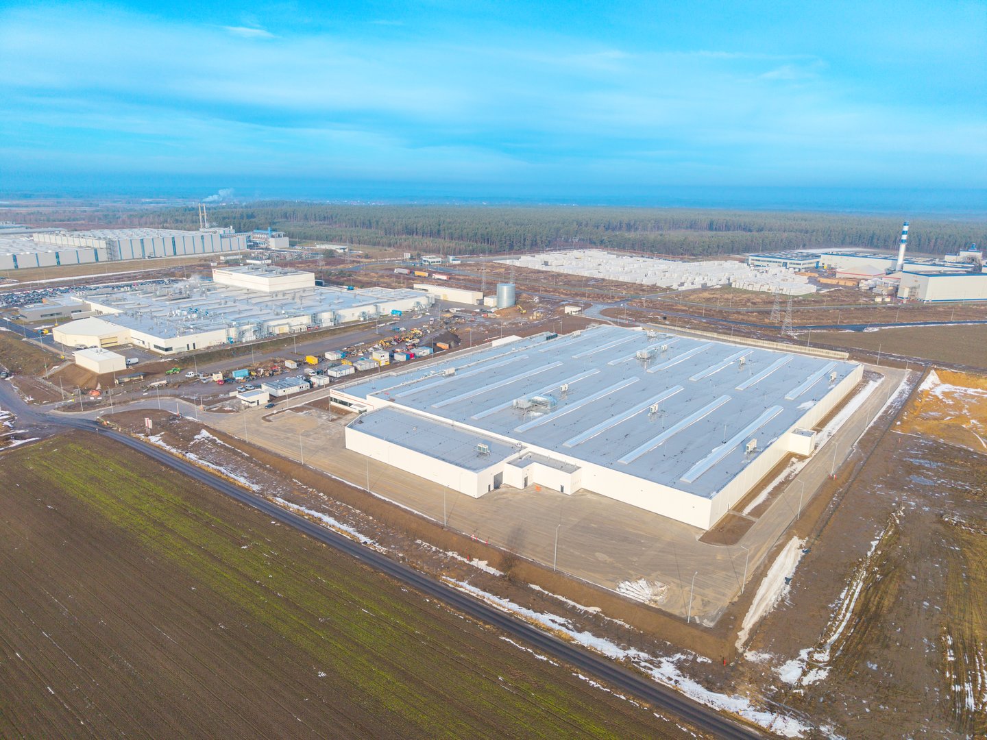 Hala przemysłowa o prostej, funkcjonalnej formie architektonicznej, oparta na geometrycznej bryle z wyraźnie wydzieloną częścią biurowo-socjalną oraz produkcyjną. Elewacje utrzymano w powtarzalnym, modułowym układzie paneli i przeszkleń, zgodnym z rytmem konstrukcji obiektu. Strefa produkcyjna została zaprojektowana jako przestrzeń o dużych rozpiętościach umożliwiających elastyczne zagospodarowanie technologiczne, z bezpośrednim dostępem do stref logistycznych, manewrowych i magazynowych. W obiekcie przewidziano również część magazynową wspierającą procesy produkcyjne, a część biurowo-socjalna została podkreślona większym udziałem przeszklenia i bardziej uporządkowaną kompozycją elewacji. Całość utrzymano w estetyce współczesnego obiektu przemysłowego o wysokiej funkcjonalności operacyjnej.